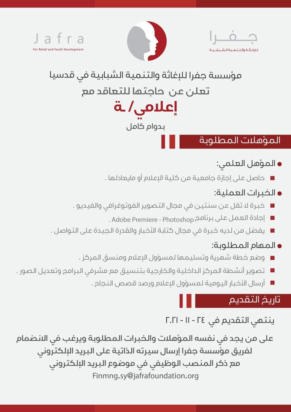 فرصة عمل في مركز جفرا في قدسيا لشاغر في قسم الاعلام بدوام كامل