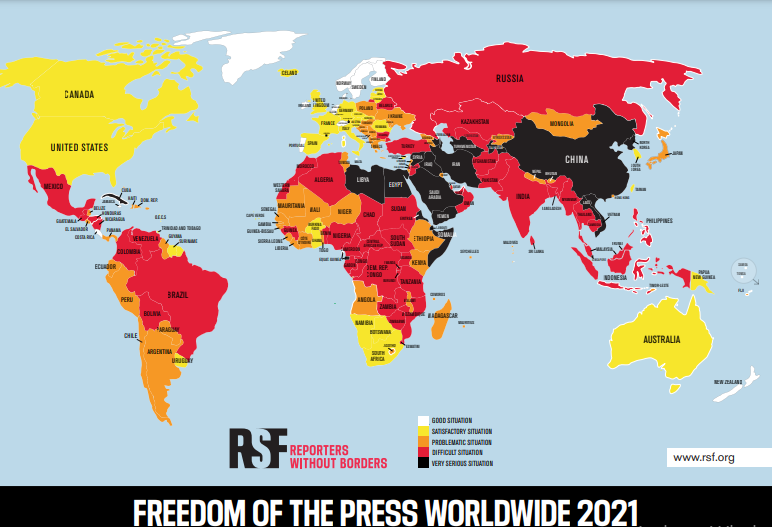 يُظهر التصنيف العالمي لحرية الصحافة، الذي يُقيِّم الوضع الإعلامي في 180 بلداً، أن ممارسة العمل الصحفي تواجه عراقيل شديدة في 73 دولة وتئن تحت وطأة القيود في 59 دولة أخرى، أي ما مجموعه 73٪ من البلدان التي قُيمت. وتتوافق هذه الأرقام مع عدد الدول القابعة في المنطقة الحمراء أو السوداء على خريطة حرية الصحافة، حيث يُعتبر الوضع صعباً أو خطيراً للغاية، وأيضاً تلك الموجودة في المنطقة البرتقالية، حيث يبقى وضع العمل الصحفي “إشكالياً”.