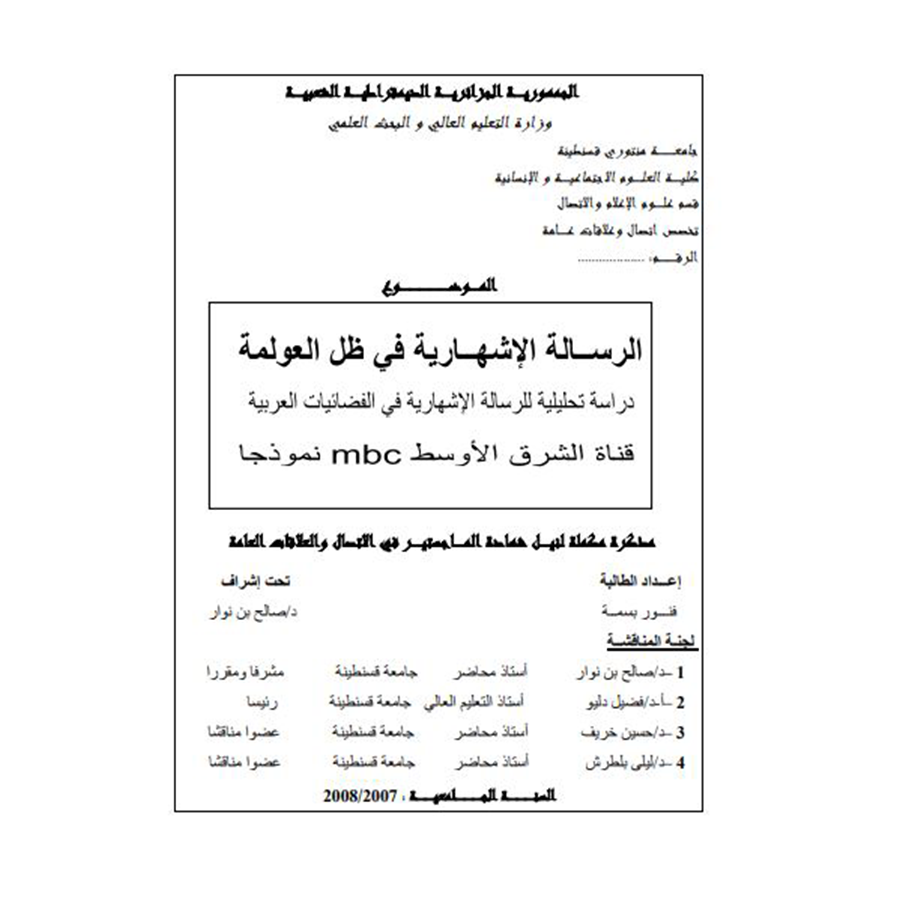 الرسالة الإشهارية في ظل العولمة: دراسة تحليلية للرسالة الإشهارية في الفضائيات العربية – قناة الشرق الأوسط MBC نموذجًا