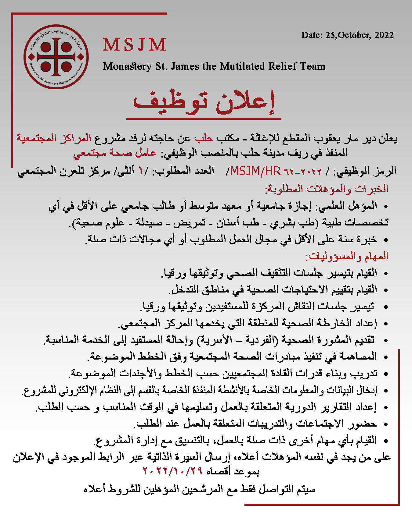 يعلن  دير مار يعقوب المقطع للإغاثة في ريف حلب عن توفر الشاغر التالي :