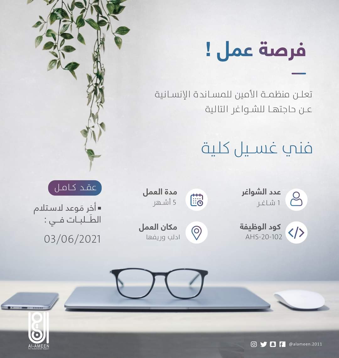 تعلن الأمين للمساعدة الإنسانية عن حاجتها لفني غسيل كلية، في سورية ،إدلب وريفها