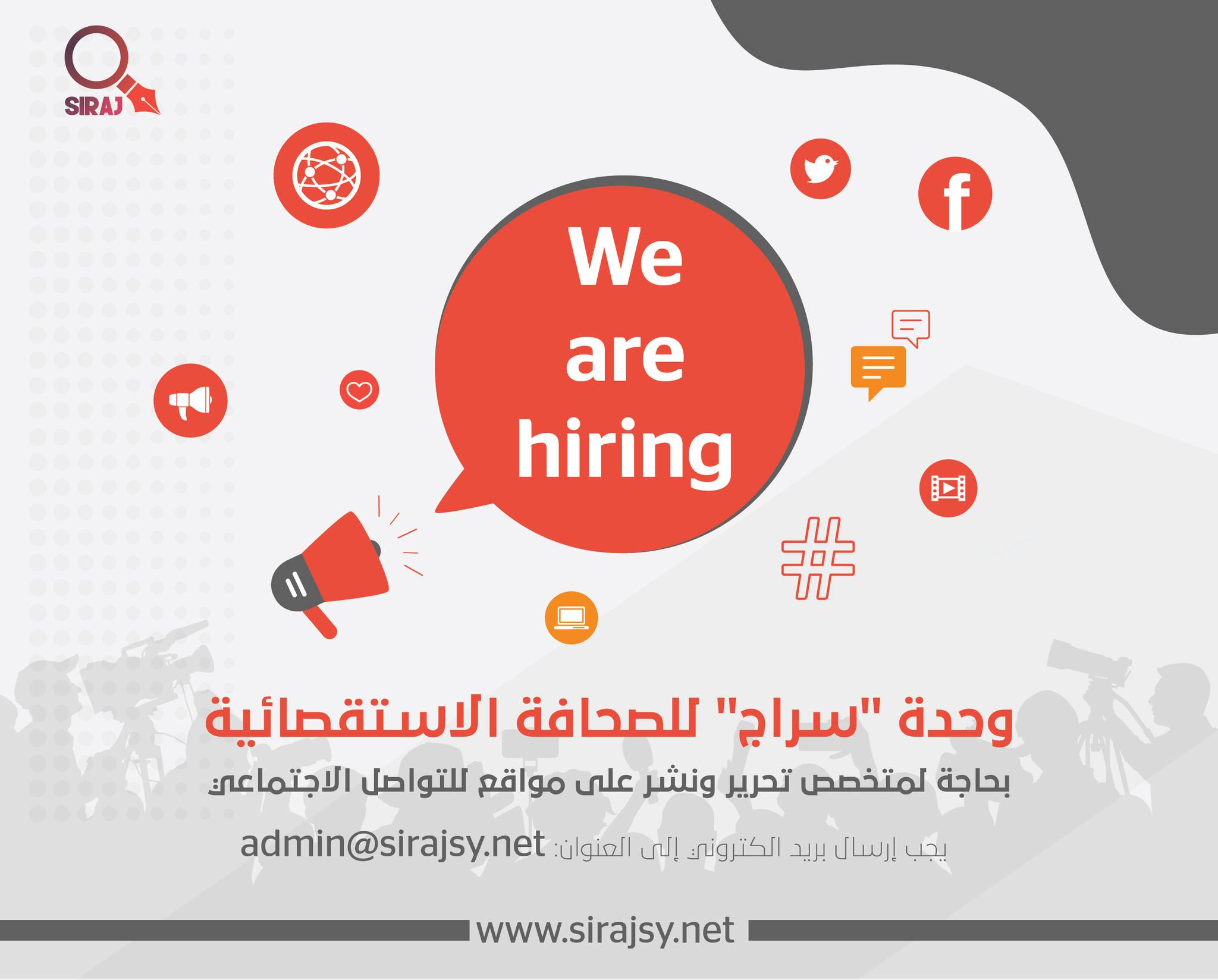 يجب إرسال بريد إلكتروني إلى [email protected] يتضمّن السيرة الذاتية للمتقدم على أن يكون عنوان البريد (محرّر مواقع التواصل الاجتماعي – سراج)