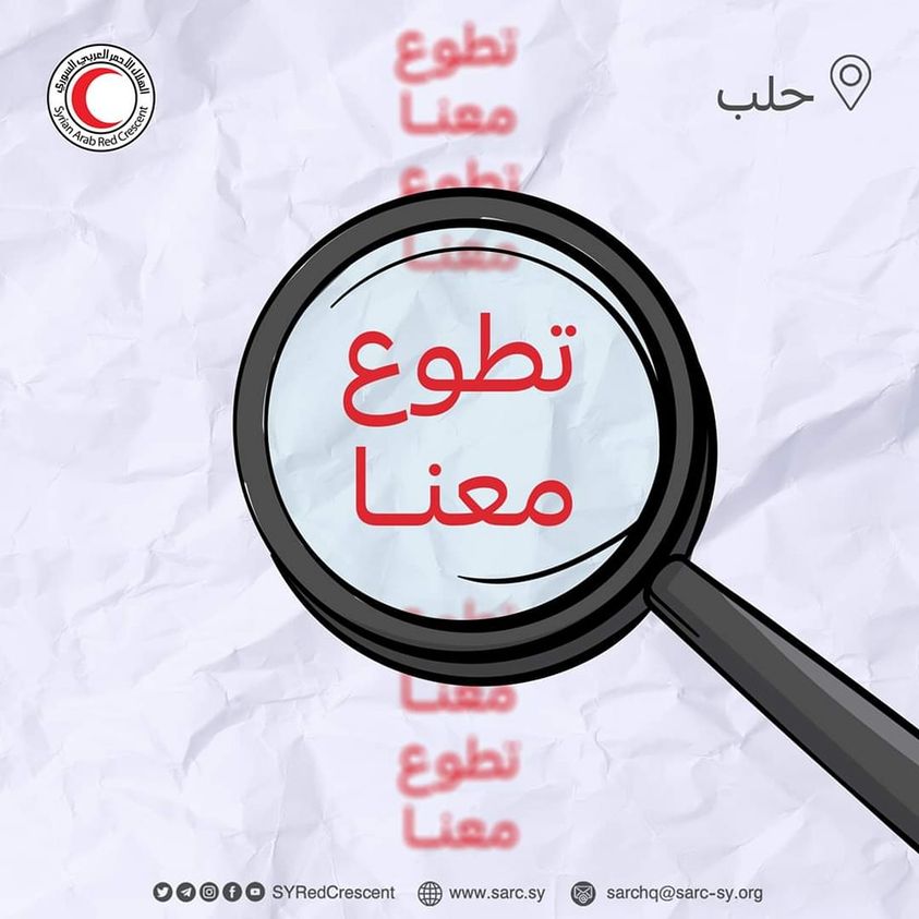 تعلن منظمة الهلال الأحمر العربي السوري فرع حلب عن حاجتها لمتطوعين ضمن إدارة المياه وإعادة التأهيل
