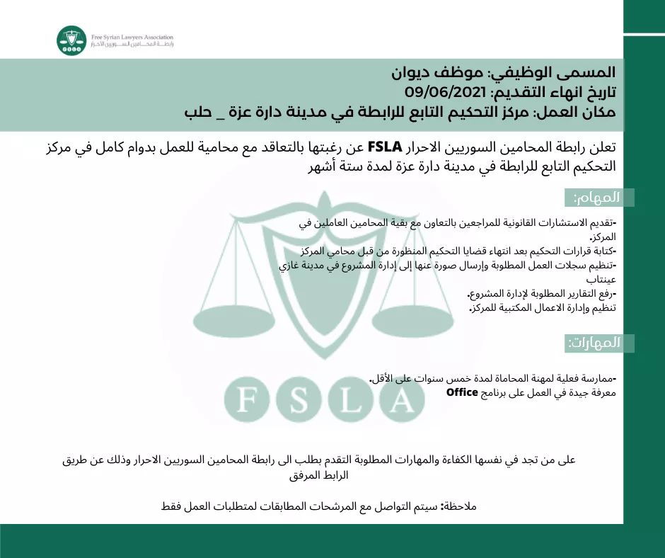 تعلن رابطة المحامين السوريين الاحرار FSLA عن رغبتها بالتعاقد مع محامية / حقوقية للعمل بدوام كامل
