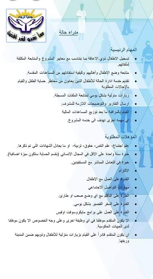 عن حاجتها الى مدراء حالة ضمن مشروع الحماية الاجتماعية المتكاملة للأطفال ذوي الاعاقة