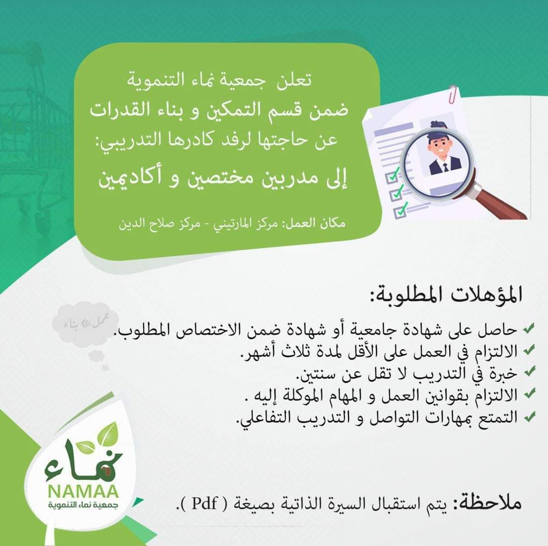 تعلن #جمعية_نماء_التنموية ضمن #قسم_التمكين_وبناء_القدرات عن حاجتها الى #مدربين بالتخصصات التالية: