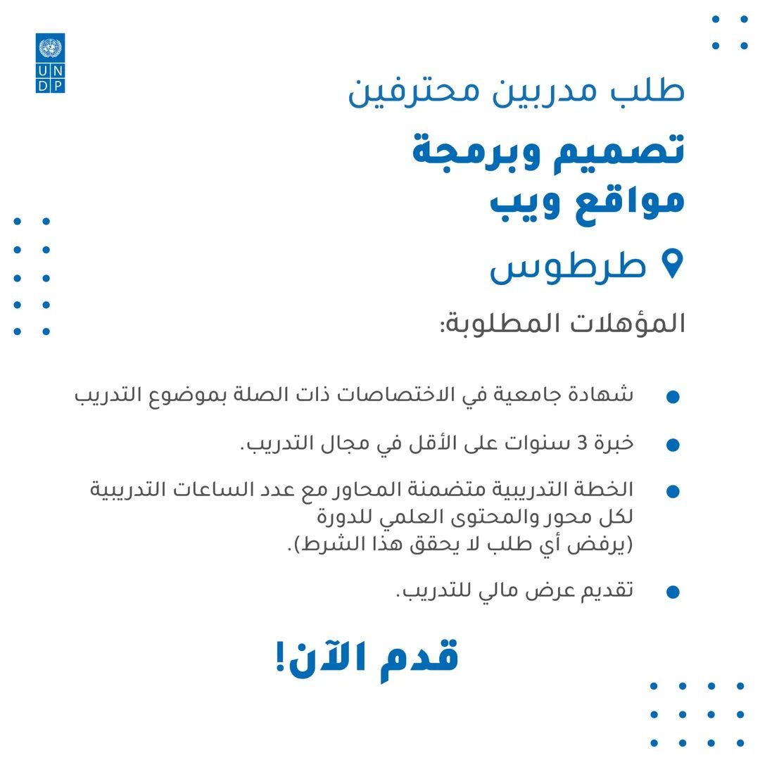 يعلن مكتب برنامج الأمم المتحدة الإنمائيUNDP في طرطوس عن توفر فرصة عمل لمدرب في مجال تصميم وبرمجة مواقع ويب في مركز تمكين الشباب Youth Empowerment Project – UNDP في محافظة طرطوس.
