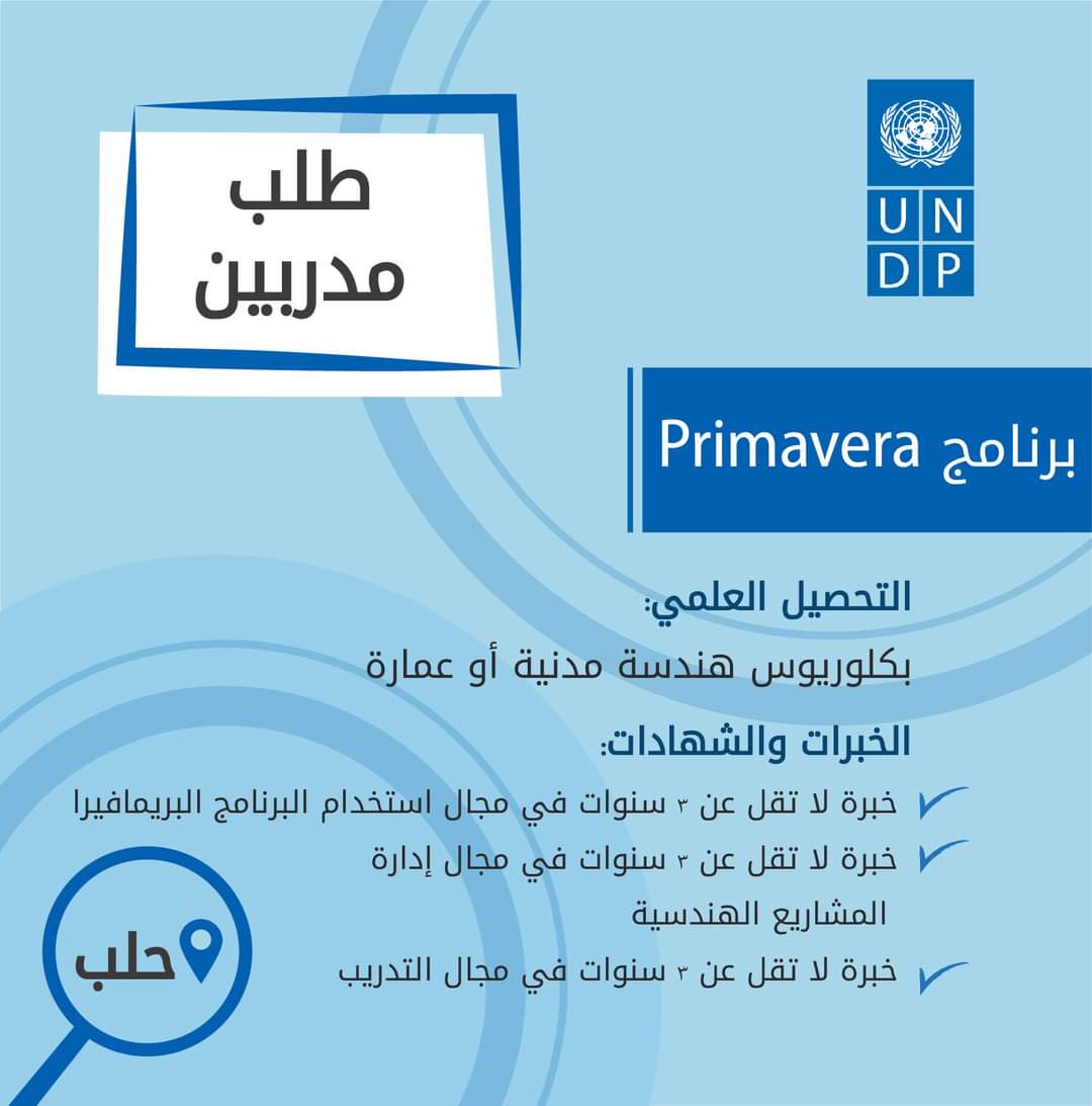 يعلن مكتب برنامج الأمم المتحدة الإنمائيUNDP في #حلب عن توفر فرصة عمل ضمن مركز تمكين الشباب لمدربين برنامج Primavera