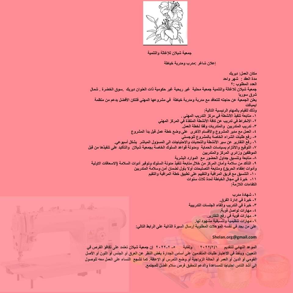 تعلن جمعية شيلان الخيرية للإغاثة والتنمية عن توفر شاغر