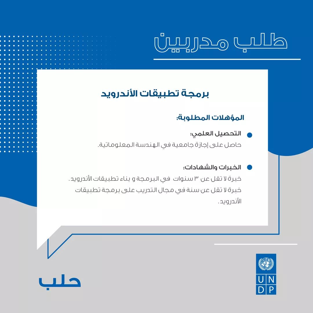يعلن مكتب برنامج الأمم المتحدة الإنمائيUNDP في حلب عن توفر فرصة عمل ضمن مركز تمكين الشباب لمدرب محترف في برمجة تطبيقات الأندرويد وفق المؤهلات التالية: