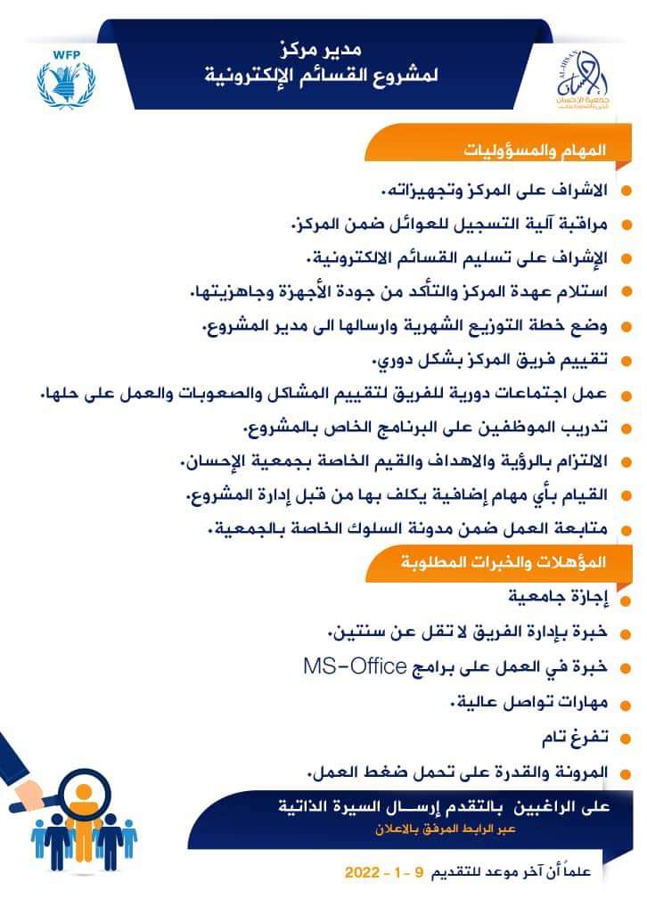 تعلن جمعية الإحسان الخيرية التنموية عن توفر الشاغر التالي ضمن قسم الاغاثة مشروع القسائم الالكترونية بالتعاون مع برنامج الأغذية العالمي: