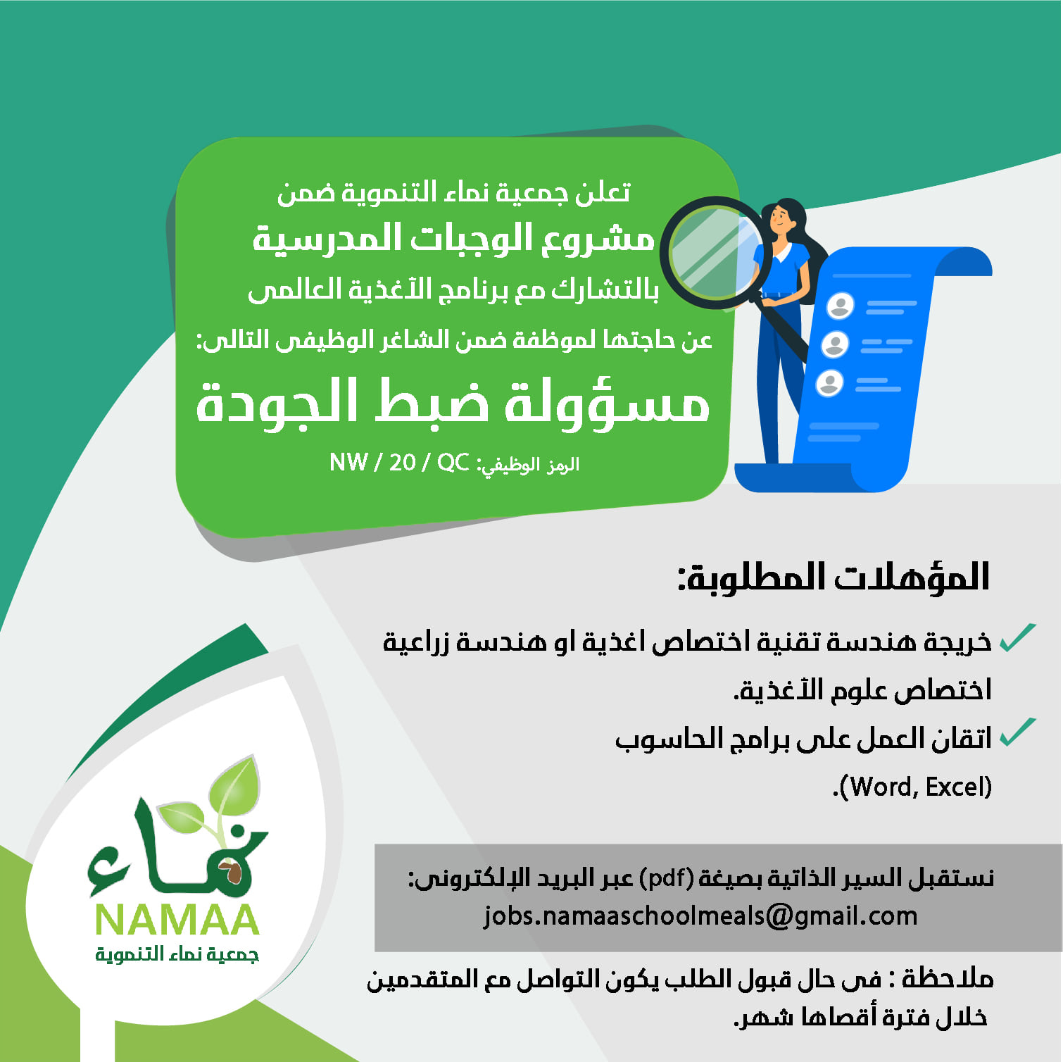 - المسمى الوظيفي مسؤولة ضبط جودة