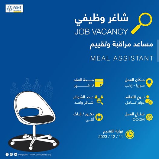 - Vacancy Title: مساعدة مراقبة وتقييم – MEAL Assistant