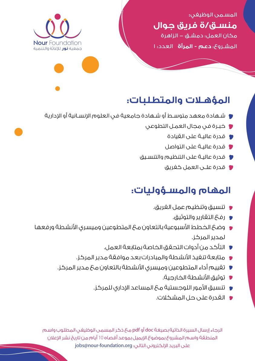 تعلن جمعية نور عن حاجتها لمنسق/ة فريق جوالة وفق الشروط المرفقة بالصورة،.