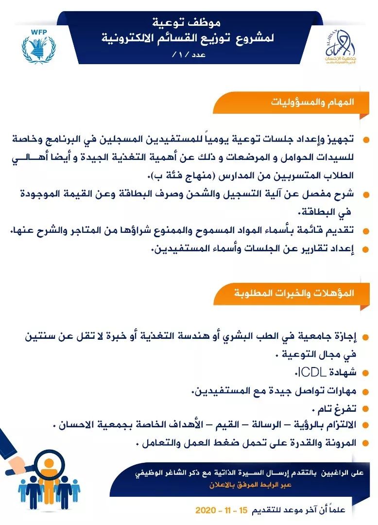 تعلن جمعية الإحسان الخيرية التنموية عن توفر شاغر “موظف توعية” ضمن قسم الاغاثة، مشروع توزيع القسائم الإلكترونية بالتعاون مع برنامج الأغذية العالمي