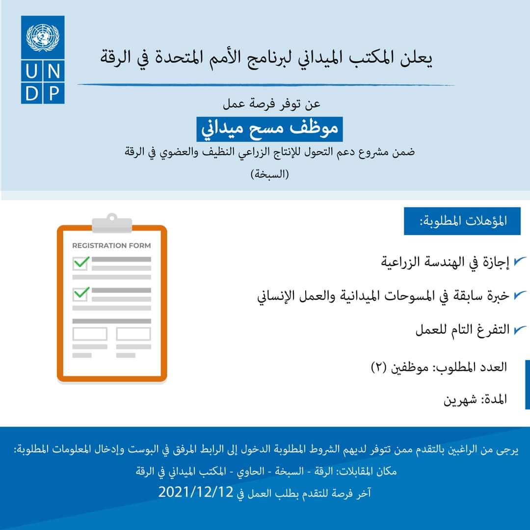 يعلن برنامج الأمم المتحدة الإنمائي في الرقة عن توفر فرصة عمل موظف مسح ميداني