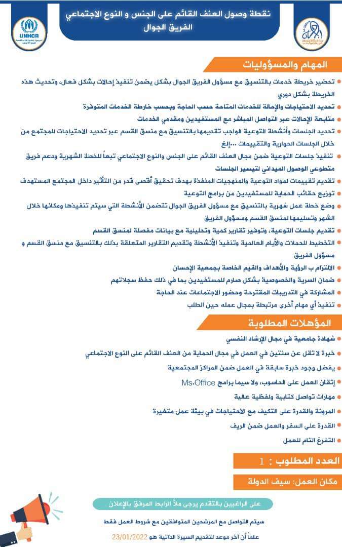تعلن جمعية الإحسان الخيرية التنموية عن توفر الشاغر التالي ضمن قسم الحماية مشروع المراكز المجتمعية بالتعاون مع مفوضية الأمم المتحدة لشؤون اللاجئين