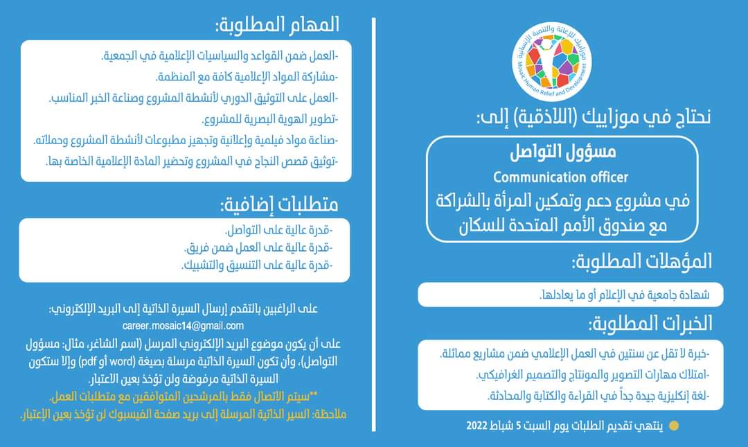 - Employer: موزاييك للأغاثة والتنمية الإنسانية